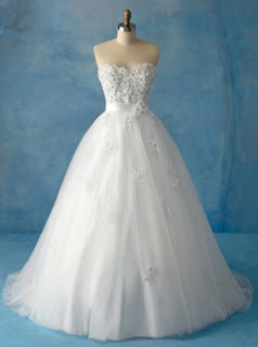 Capturing Snow White's gentle grace and beauty, and inspired by nature, this net-over-satin ballgown features a lace bodice of organza apple blossoms with shimmering rhinestone and crystal centers and a skirt with scattered blossom detail. A lovely satin sash and back bow make a graceful finish.